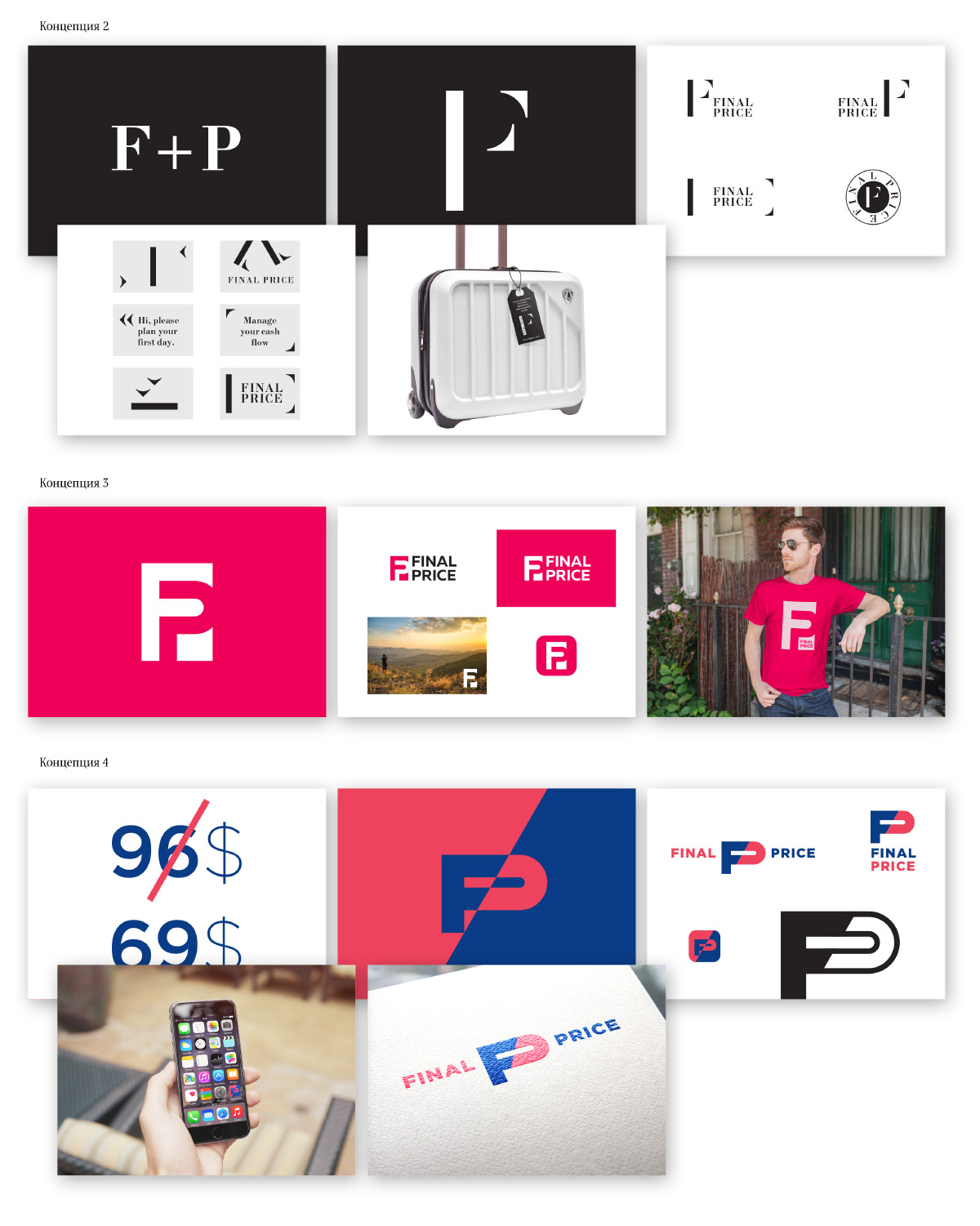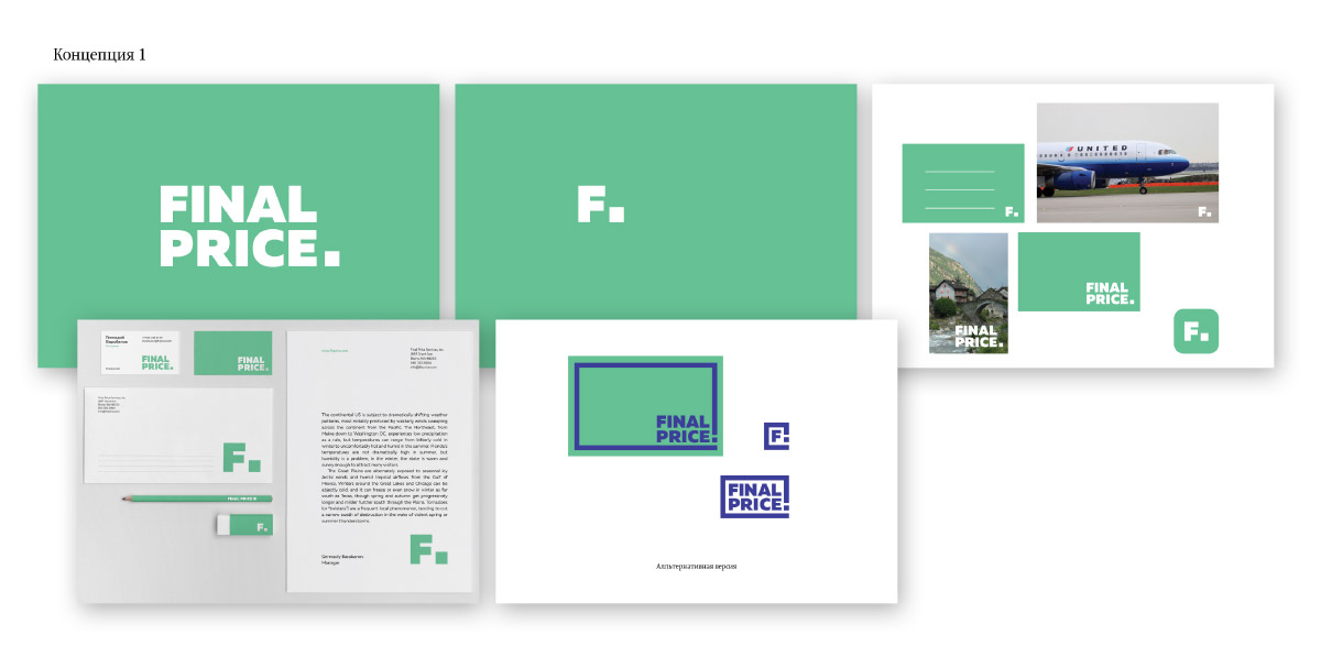 Поясню на примере логотипа Final Price. Если посмотреть как создавался фирменный стиль, то заметны формальные варианты решения задачи. Неубедительная игра в форму и контрформу, декор ради декора. Примечателен комментарий — «Игра с буквами заказчику показалась весьма поверхностным решением».