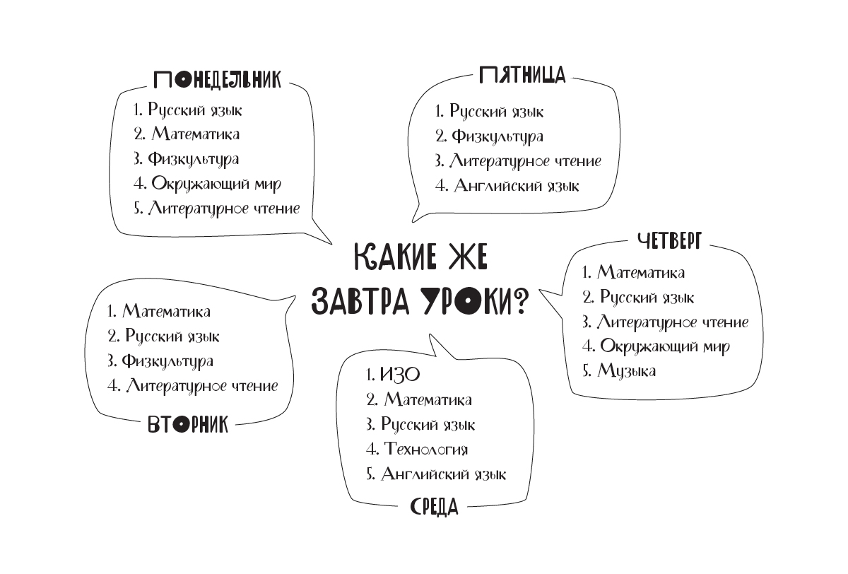 Ещё пример с расписанием уроков. Идея — вставить в центр вопрос, а дни недели оформить баблами. Получается, вопрос задан и дни недели на него отвечают.