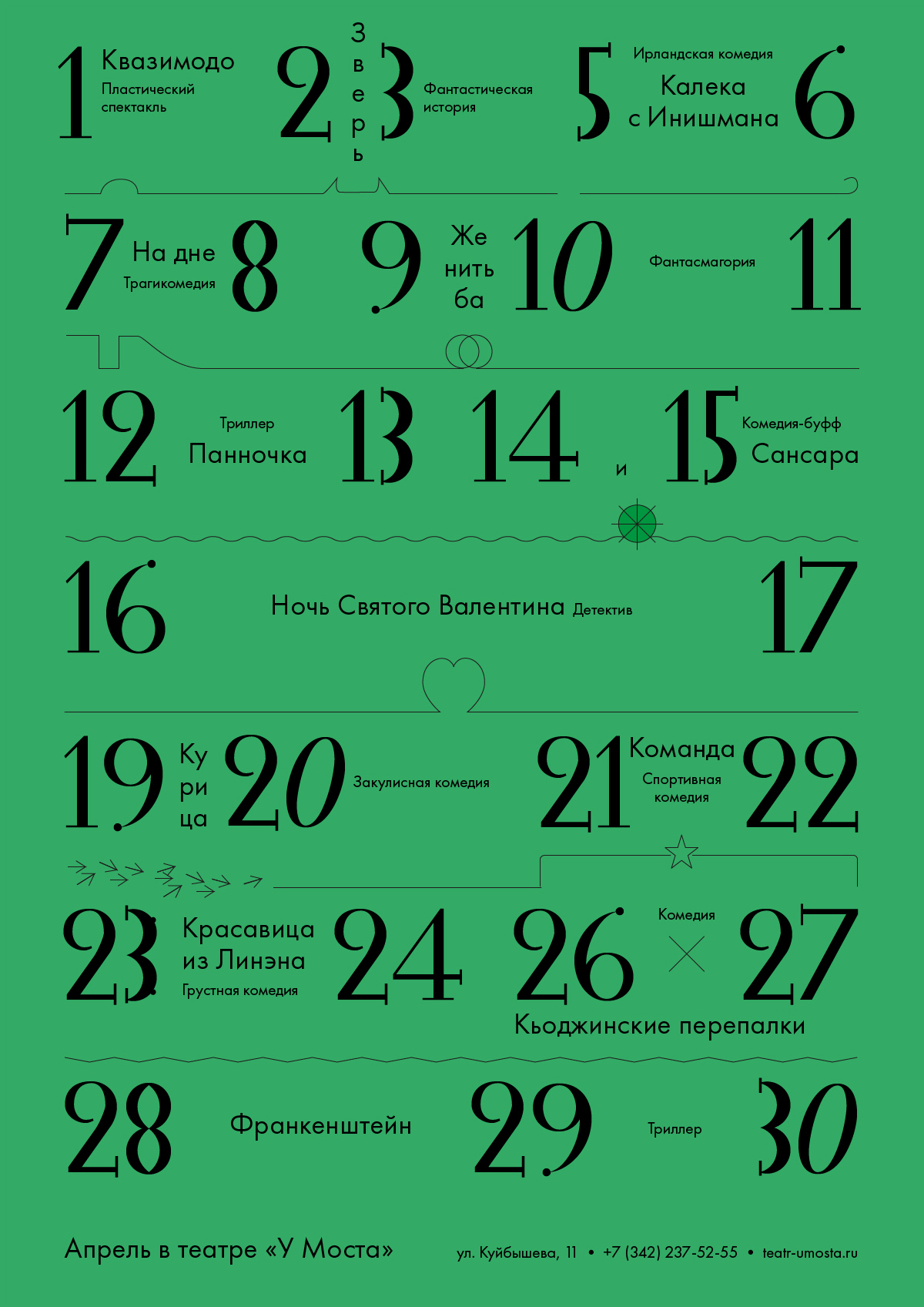 Пример с афишей «Театра у Моста». Здесь символы выполняют две функции: работают как межстрочные разделители и как визуальная поддержка названий спектаклей.
